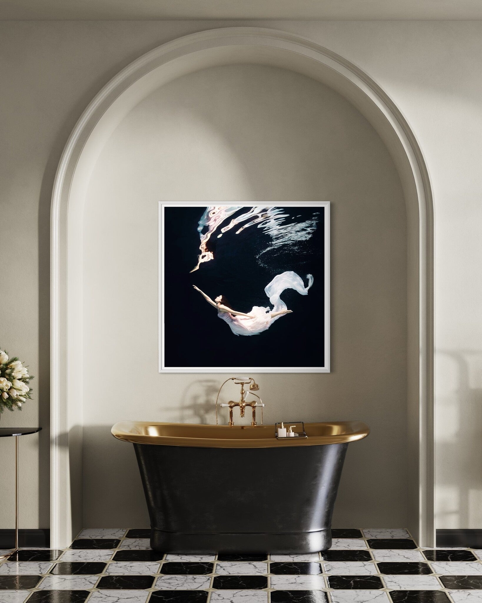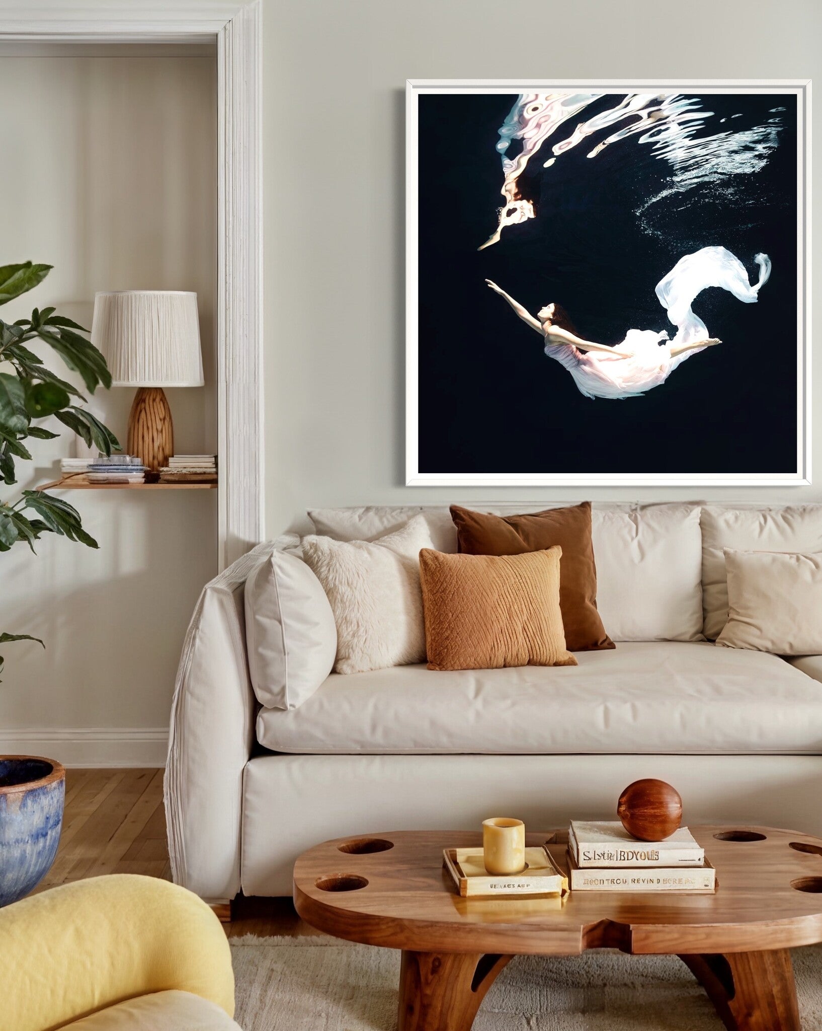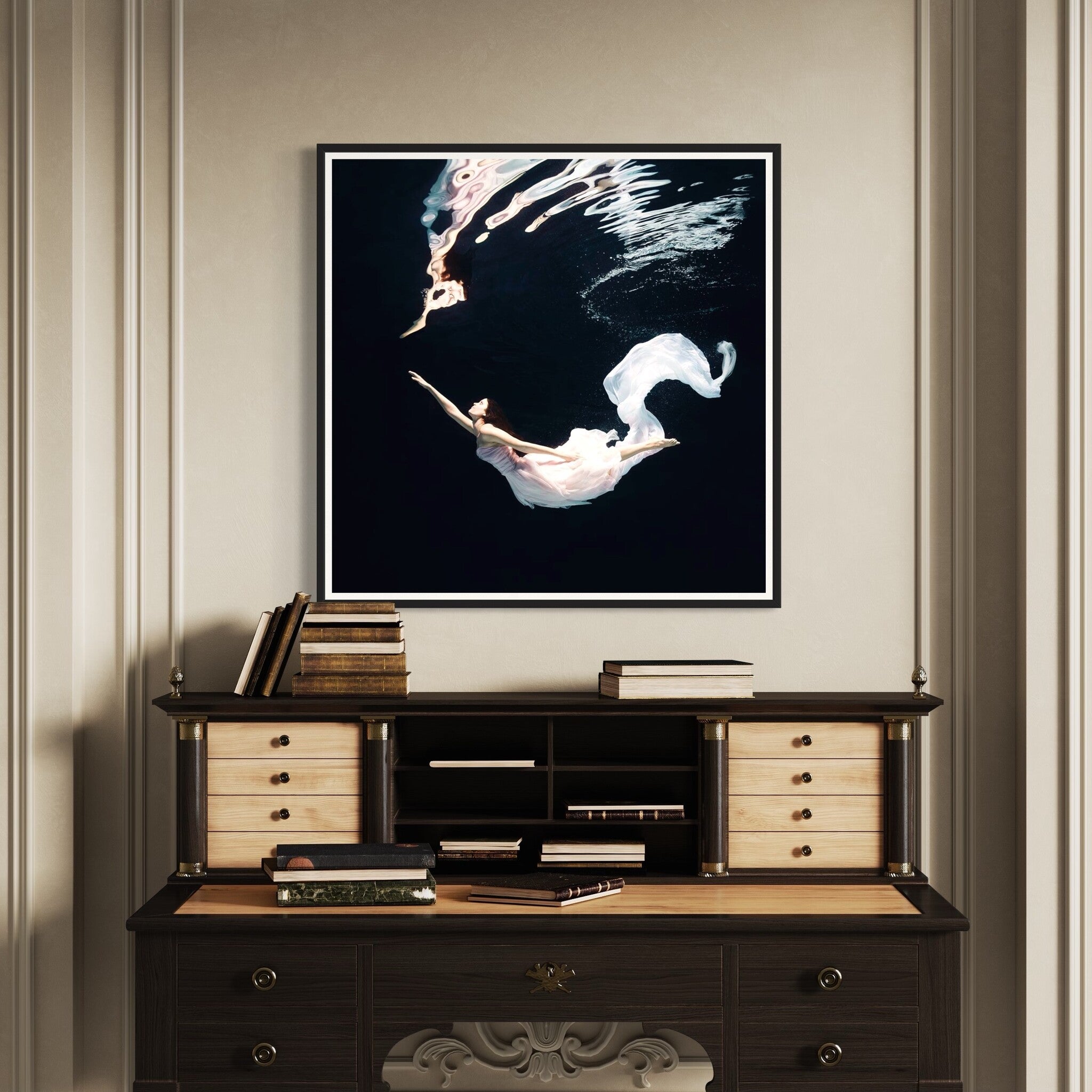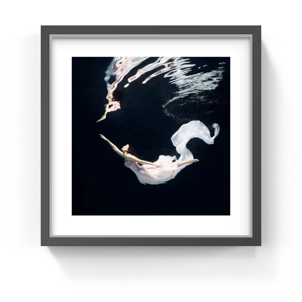 This captivating photograph of a female ballet dancer performing underwater captures an ethereal moment of grace and elegance. The fluid motion of her white dress creates a mesmerizing effect against the dark background, making it a striking piece of wall art. This print is perfect for adding a touch of sophistication to any space, whether it’s a residential living room, a commercial office, or a hospitality setting like a hotel lobby.
