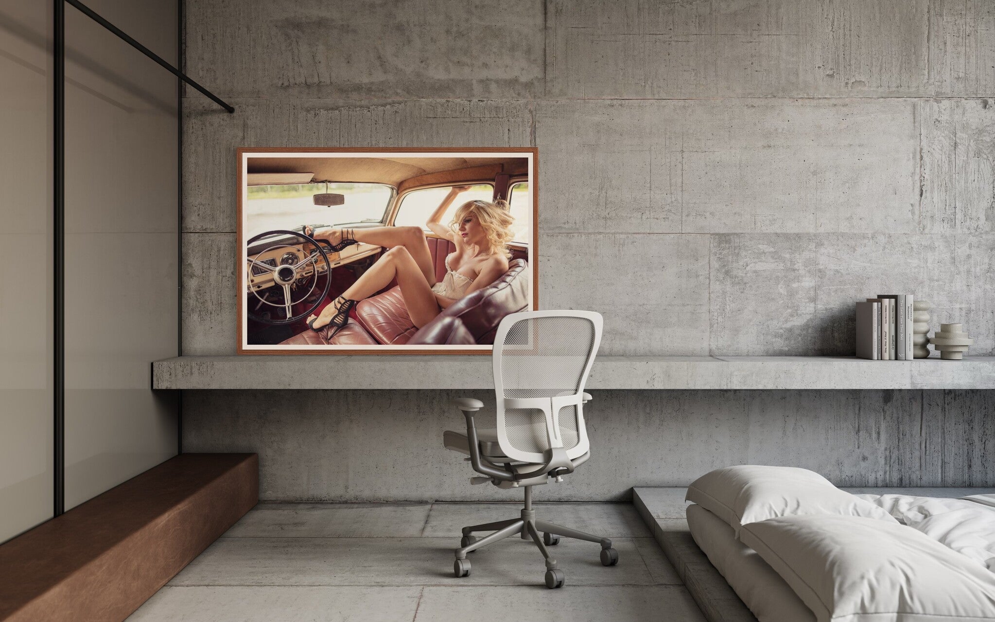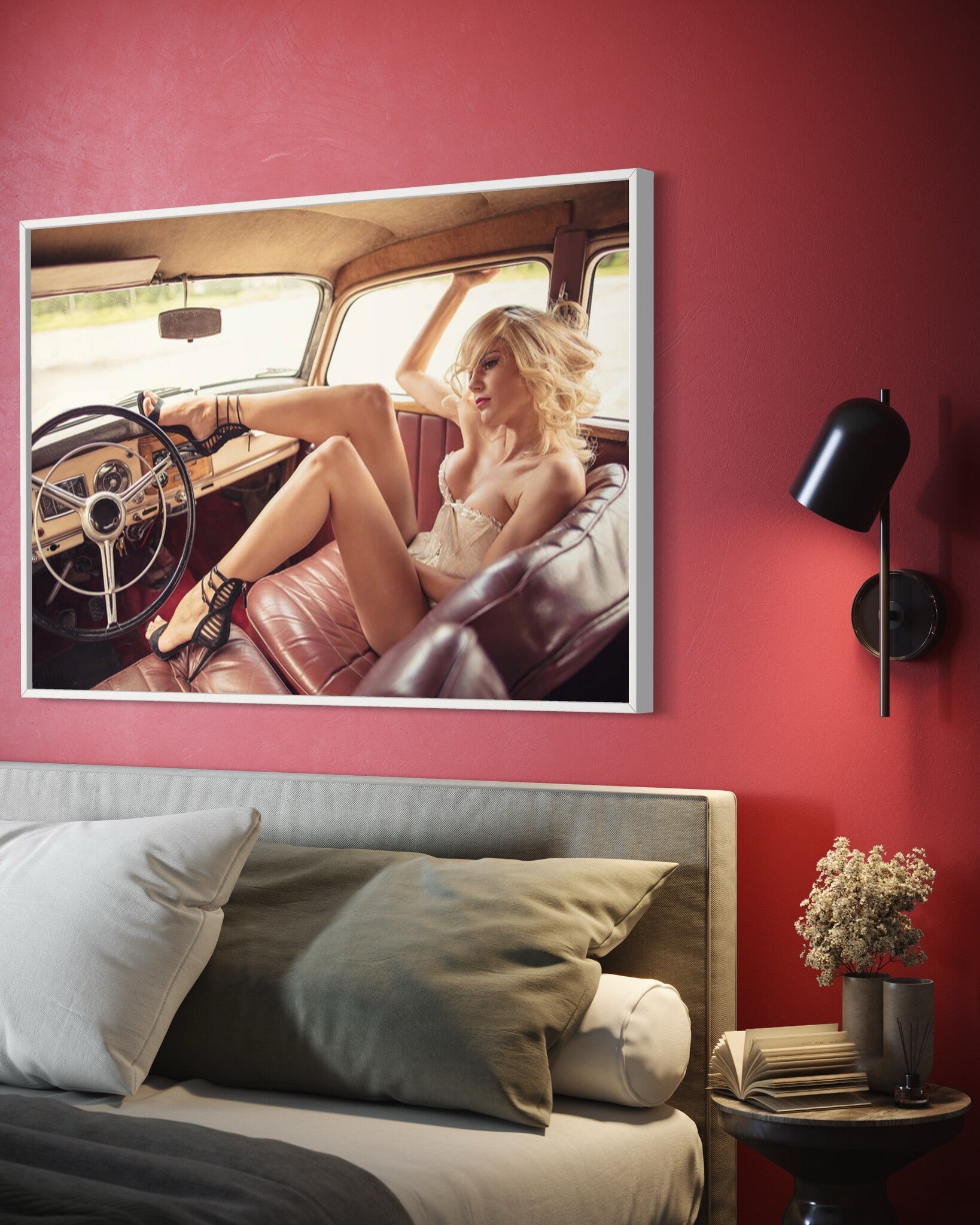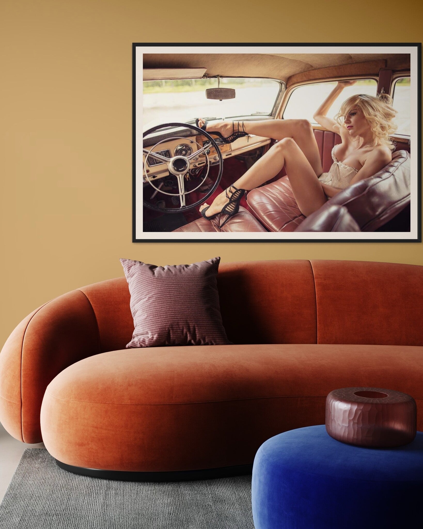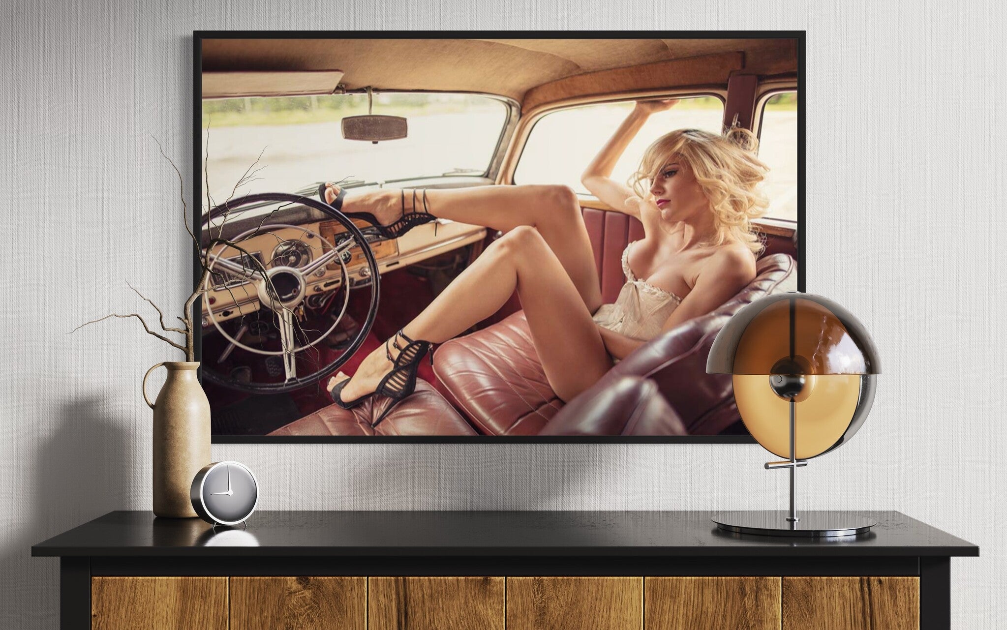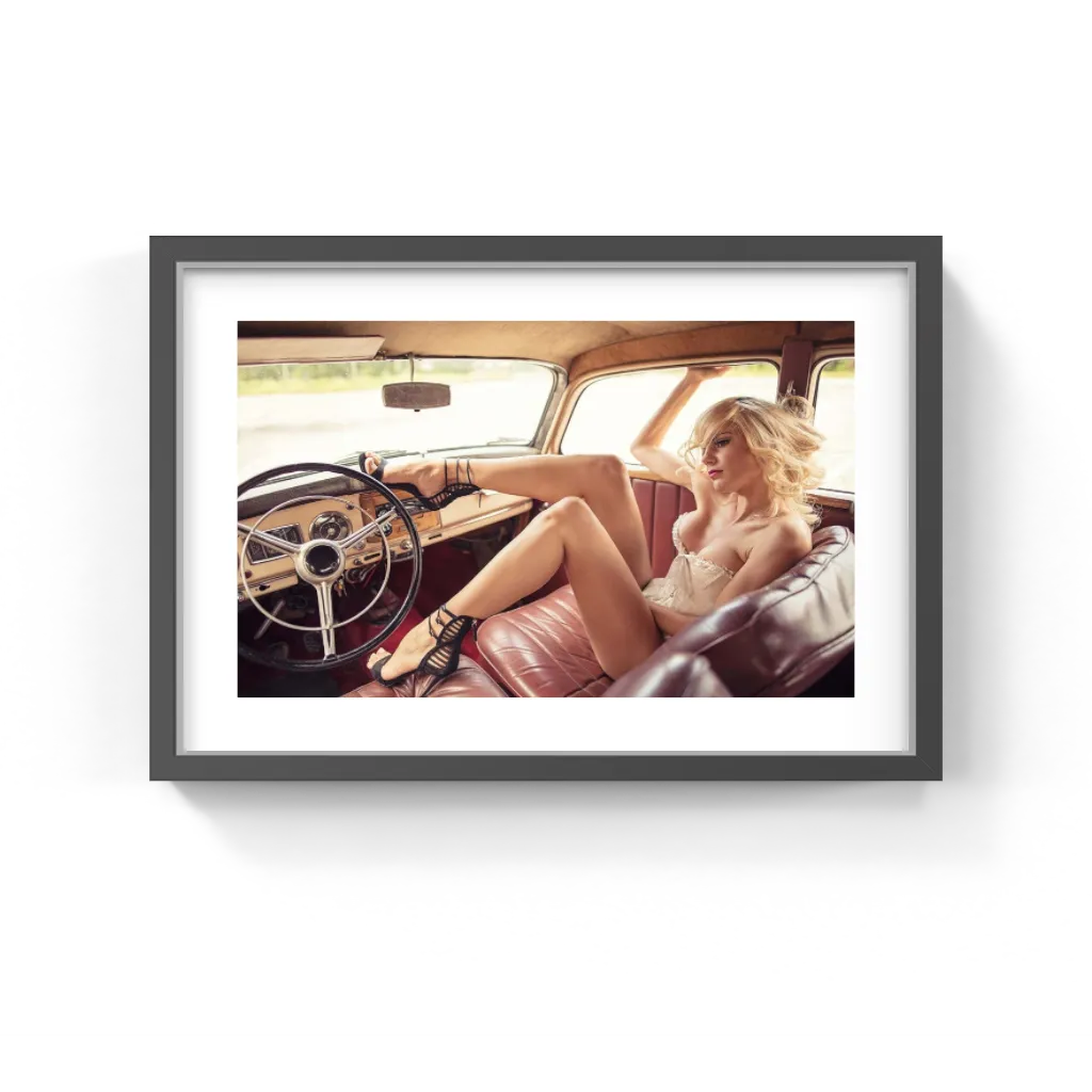 This image is a perfect addition to various decor settings, whether residential, commercial, or hospitality. In a residential space, it can serve as a bold statement piece in a living room or bedroom, adding a touch of vintage charm and sophistication. For commercial spaces like fashion boutiques or automotive showrooms, this photograph highlights a sense of style and classic beauty, enhancing the overall aesthetic of the space. In hospitality contexts such as trendy hotels or cafes, it adds an element of retro chic, inviting guests to appreciate the blend of past and present.