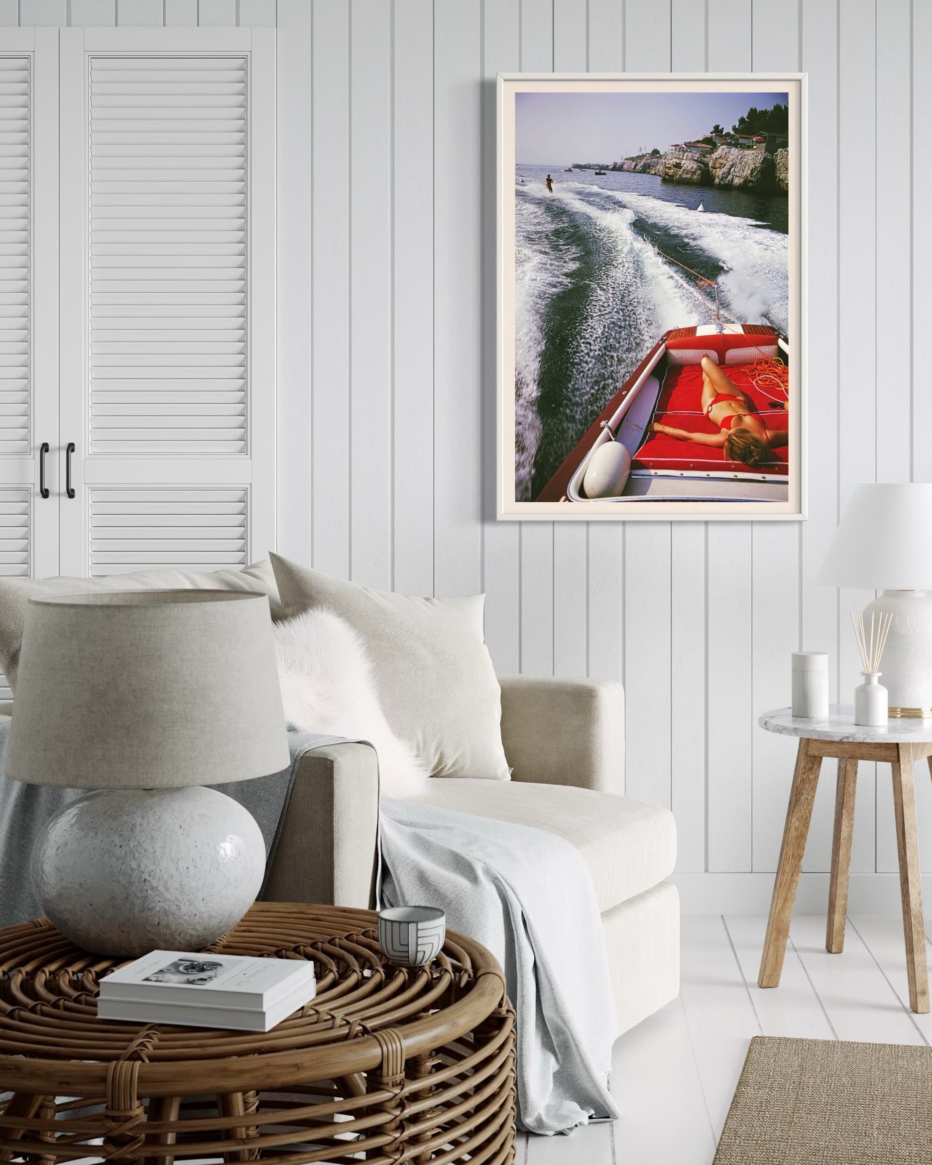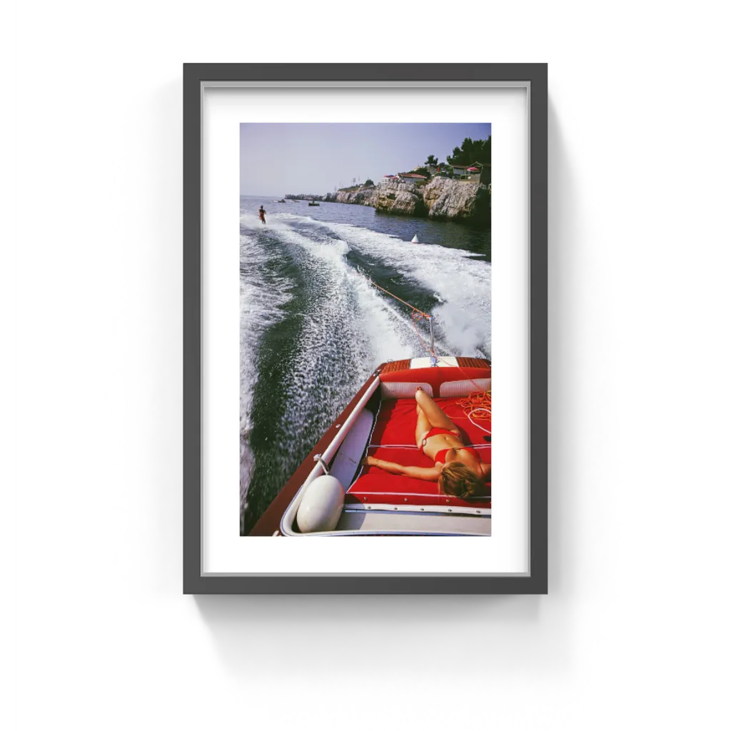 “Leisure in Antibes” by Slim Aarons epitomizes the glamorous lifestyle of the French Riviera in the 1970s. The photograph captures a sunlit scene from the stern of a sleek motorboat: a woman reclines on red cushions in a vibrant bikini while a water-skier cuts through the Mediterranean waves behind. With its perfect blend of leisure, speed, and coastal beauty, the image distills the aspirational charm of summer on the Côte d’Azur.