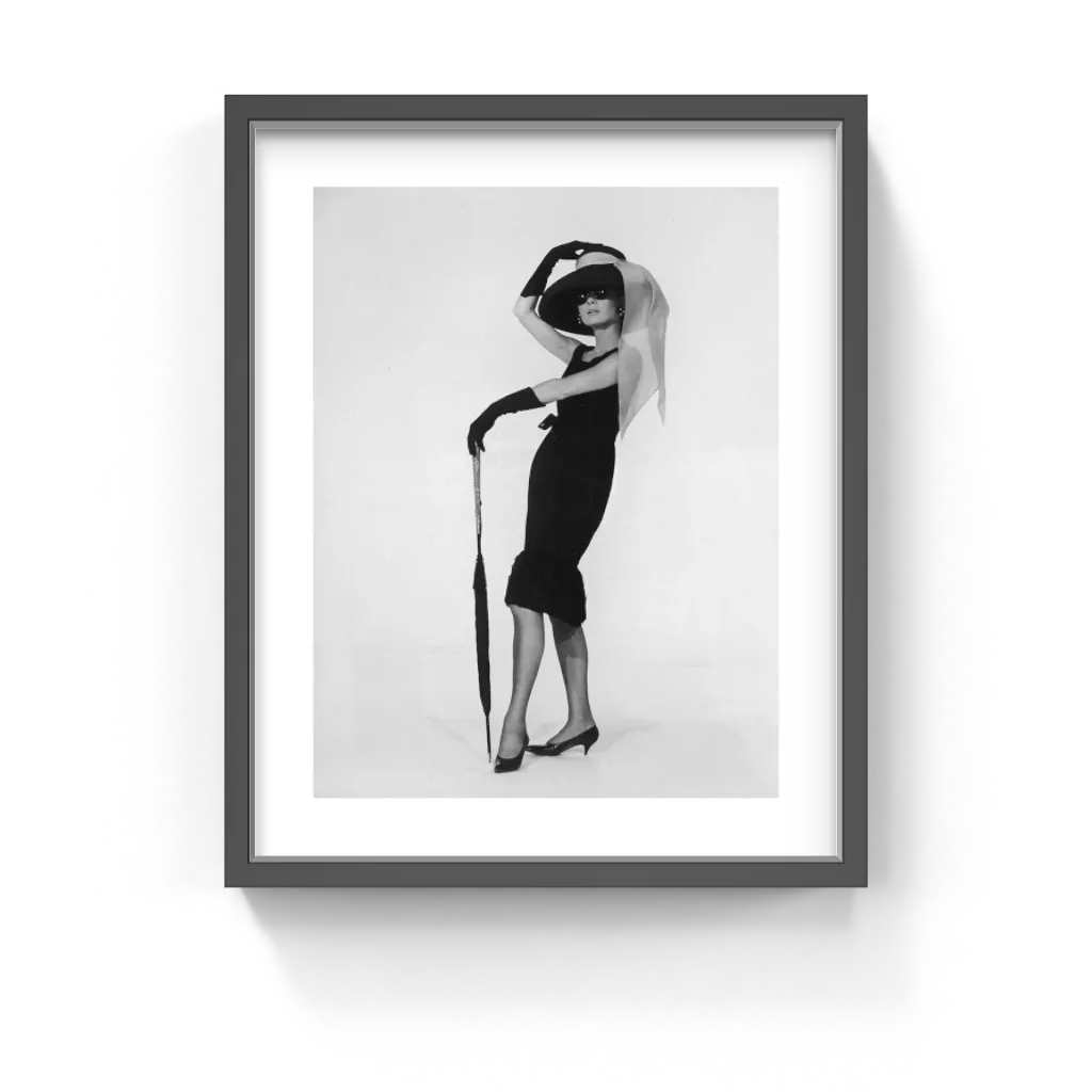 « L'Allure Élégante » met en valeur le charme et l'élégance indémodables d'Audrey Hepburn, immortalisés au plus fort du glamour des années 60. Vêtue d'une envoûtante robe de cocktail noire signée Hubert de Givenchy, Audrey se distingue par son allure impeccable sur un fond minimaliste. Cette photographie, produit promotionnel pour « Diamants sur canapé », témoigne d'une beauté intemporelle et d'un style cinématographique.