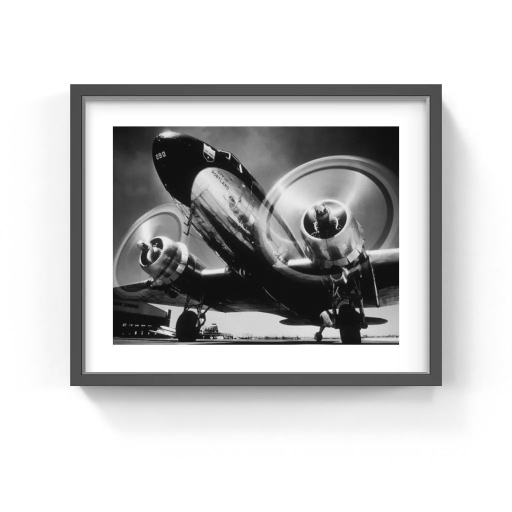 Dynamic black-and-white photograph of the “City of Portland” plane by the Hulton Archive. A classic tribute to early American aviation, ideal for interiors with a nostalgic or industrial flair.