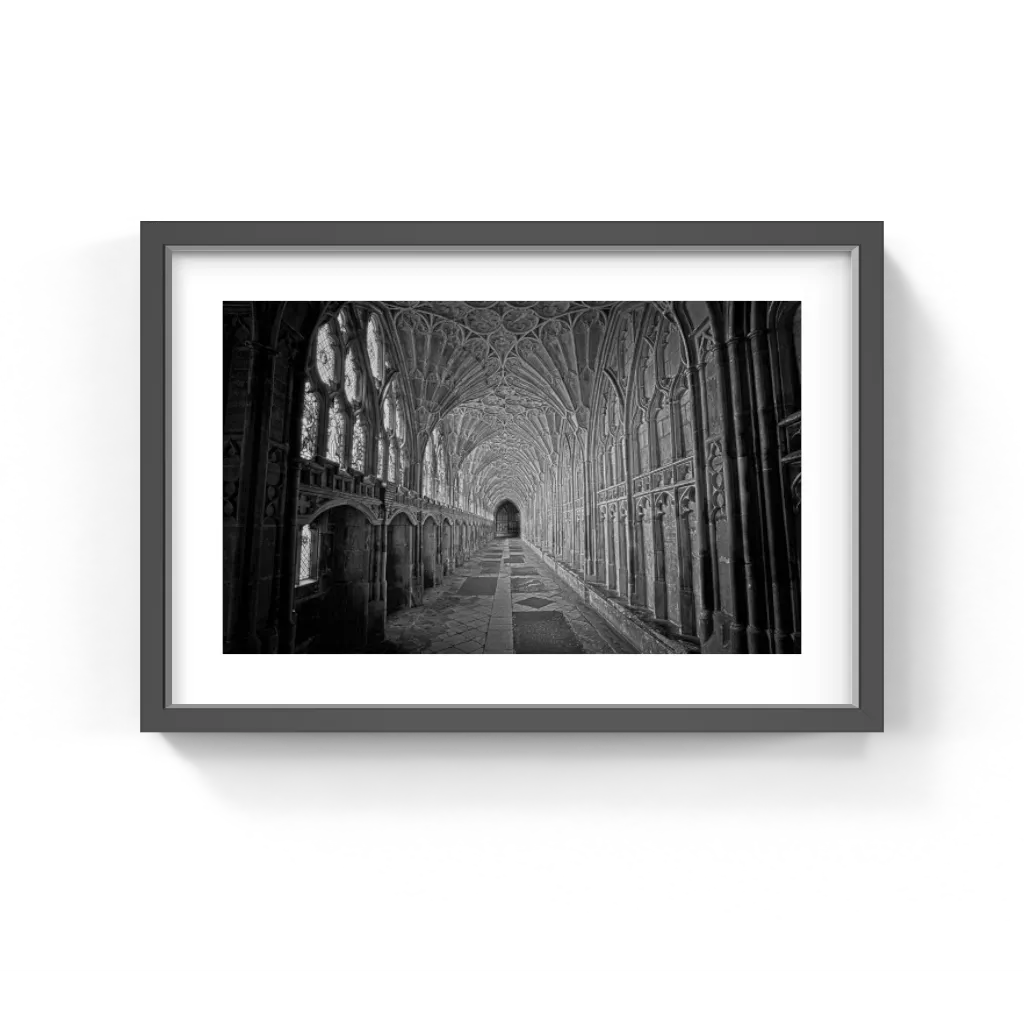 Photographie en noir et blanc de la cathédrale de Gloucester par M. Beck