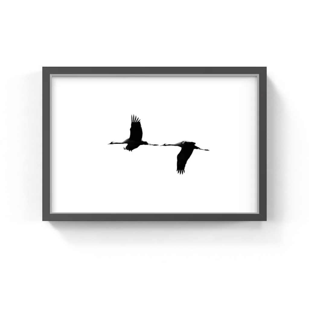 Cranes VI by Tal Paz-Fridman distills the quiet power of motion into a moment of pure simplicity. Against a stark white sky, two cranes glide in perfect harmony — their wings extended, their silhouettes precise yet fluid. The image embodies a meditative stillness, inviting reflection on balance, rhythm, and grace.